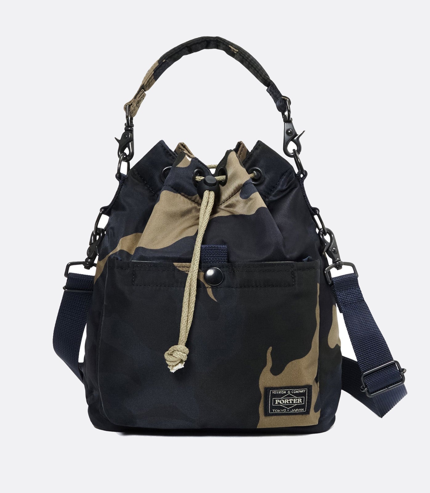 Confectionné au Japon dans un nylon résistant, ce sac adopte une silhouette cylindrique minimaliste avec fermeture cordon de serrage, permettant un accès rapide au contenu tout en conservant une excellente sécurité. Son motif Woodland Khaki camouflage apporte une dimension graphique forte, fidèle à l’esthétique utilitaire de la marque.